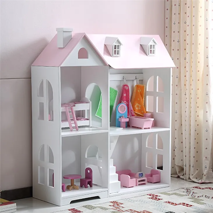 La casa de muñecas de madera blanca y rosa tiene un espacio de almacenamiento de gran capacidad. Se utiliza el diseño dos en uno. Los niños pueden colocar más libros y muñecos.